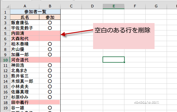 この表から、不参加の空白の行を削除したいのですが、一気に削除したい時は、次の方法で行います。