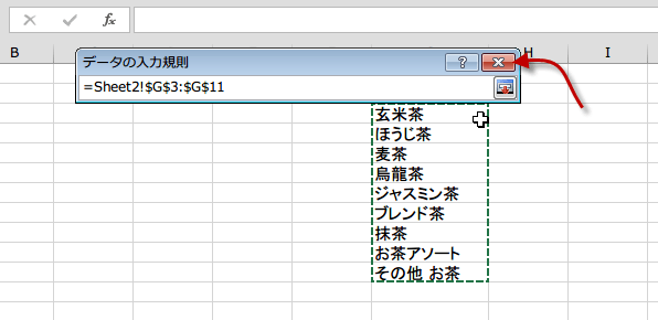 自動的に範囲が入力されたら、入力欄の×をクリックして閉じます。