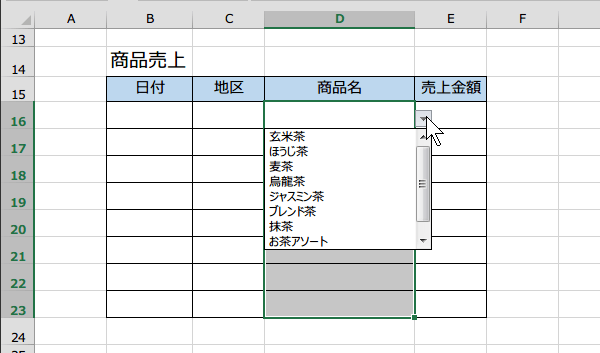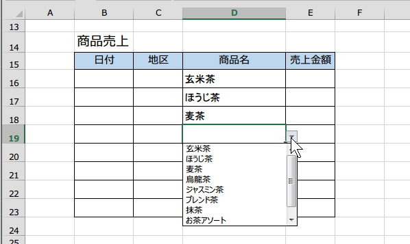 D列のセルに入力しようとすると、ドロップダウンリストが表示され項目を選ぶことができます。