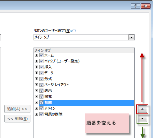 リボンのタブの並び順を変えるには、Excelのオプション設定のリボンのユーザー設定から行います。