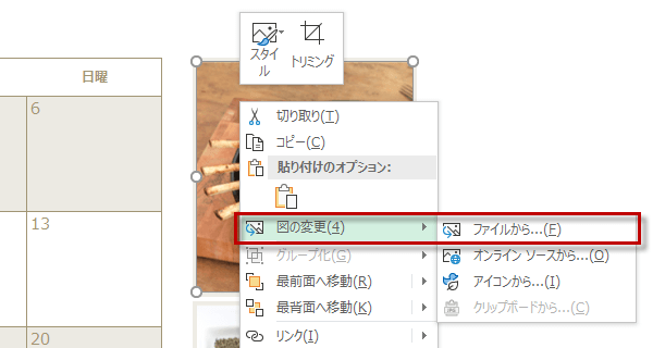 サンプルとして表示されている画像の上で右クリックして図の変更を選択、ここではPC内のファイルを選択します。