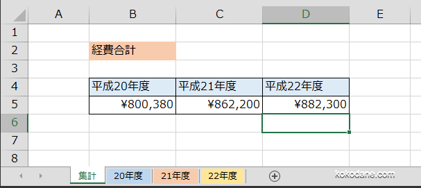 シートは、20年度、21年度、22年度とあり、それぞれの年度の費用を集計しています。