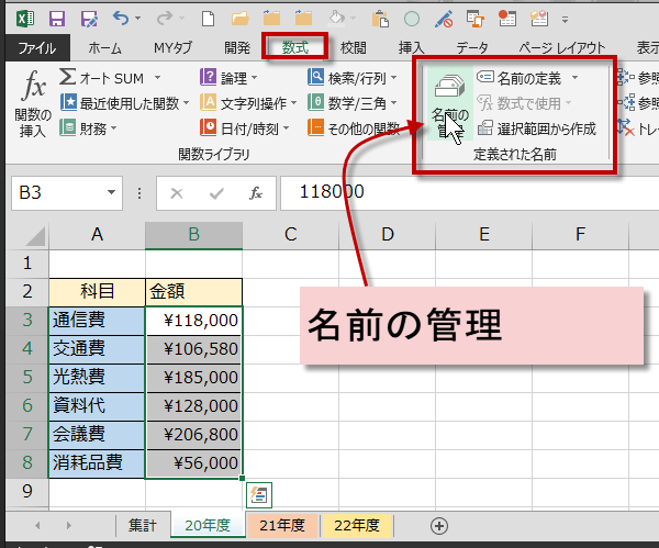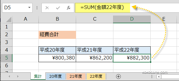 式に名前が入りました。=SUM(金額20年度)