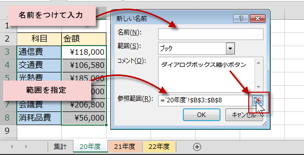 すると、新しい名前ダイアログボックスが表示されるので、参照範囲に範囲を直接入力するか、シート上で指定する時は、ダイアログボックス縮小ボタンをクリックします。