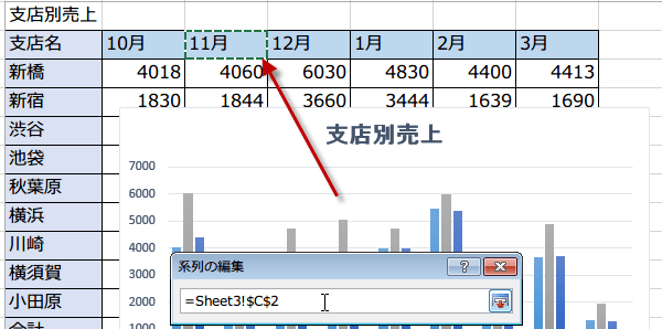 すると系列の編集ダイアログが現れますから、まず系列名を指定します。