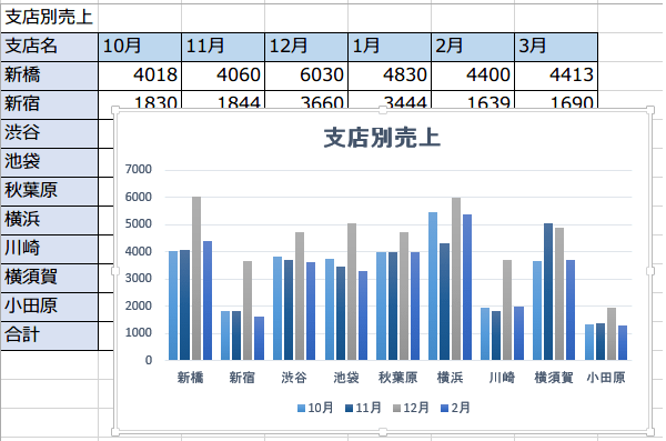 下のサンプルでは、グラフを選択しても、データ範囲が離れているために、カラーリファレンスが表示されません。