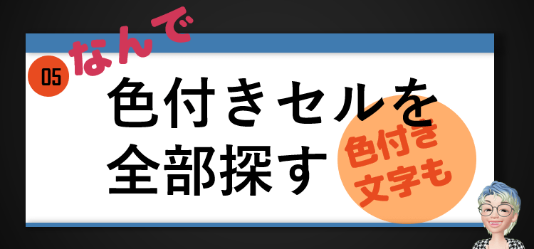 今回は、色付きセルを探したり、色付き文字を探す方法を紹介します。