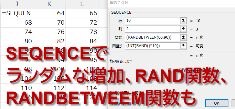 数式は、=SEQUENCE(10,3,80,(INT(RAND()*10)))と入力しています。