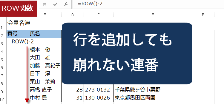 この場合、順番に振られた番号のどれか一つを削除したり追加したりしても、自動的に連番が振り直され、常に連番となるシートを作るには、ROW関数を使えば良いのです。