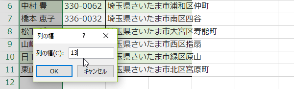 列の幅 を入力するダイアログが表示されるので、任意の数値を入力します。例では 数値を13と入力