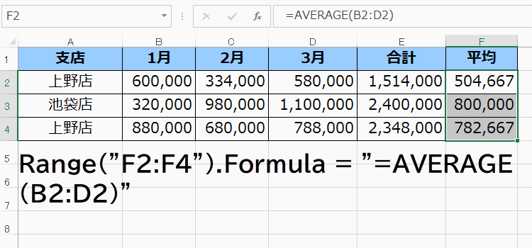 Range("F2:F4").Formula = "=AVERAGE(B2:D2)"