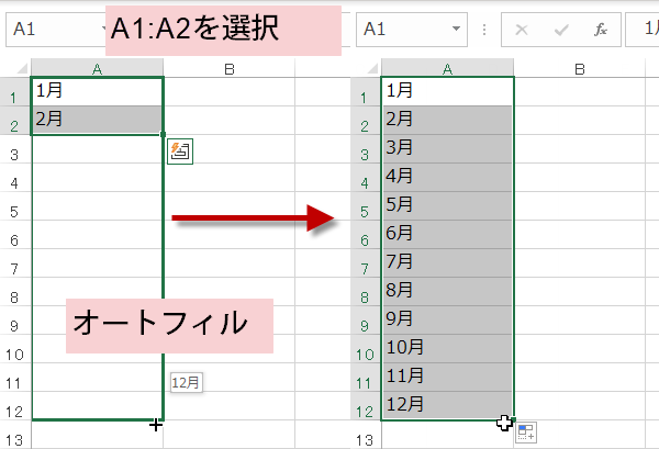 Selection.AutoFill Destination:=Range("A1:A12"), Type:=xlFillDefault