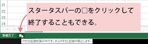 マク□の記録を終了するには、ステータスバーに表示されるマクロの記録終了ボタンからも終了できます。(ステータスバーのユーザー設定でチェックを入れておきます)