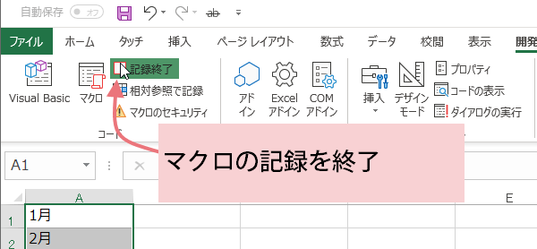 また、Range("A1").FormulaR1C1 = "1月" の部分を