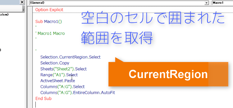 記録のマクロで可変の表をコピーするコードを作成し、多少変更を加えて、 表の途中から貼り付けることができるマクロも作成することにします。
