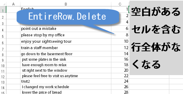 前ページで作成した「データのない不要な行を削除するマクロ」のコードを見てみましょう。