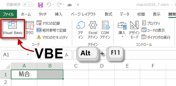 もういちど、A1セルとA2セルを結合させてから、マクロの実行ボタンをクリックします。