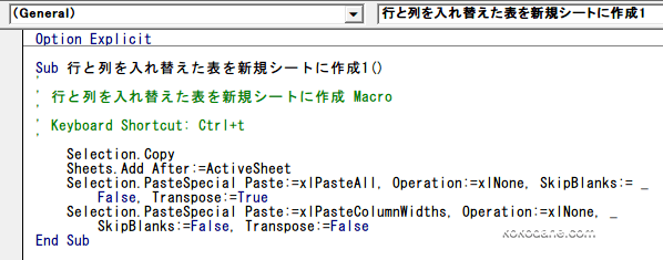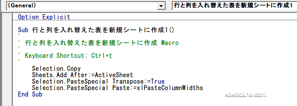 行と列を入れ替えた表を新規シートに作るマクロ