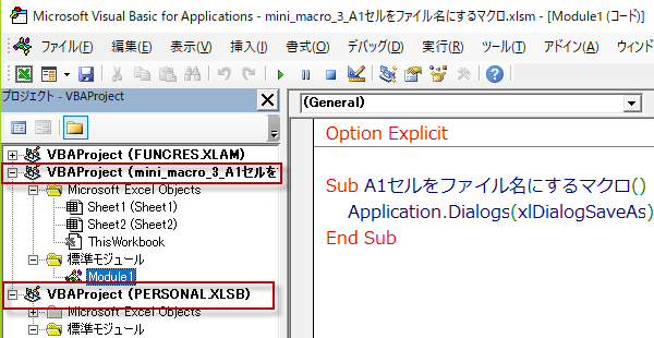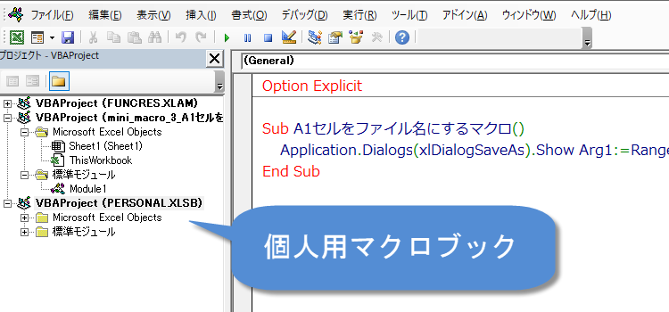 以上でPERSONAL.XLSBに「A1セルをファイル名にするマクロ」をコピーして張り付けることができました。