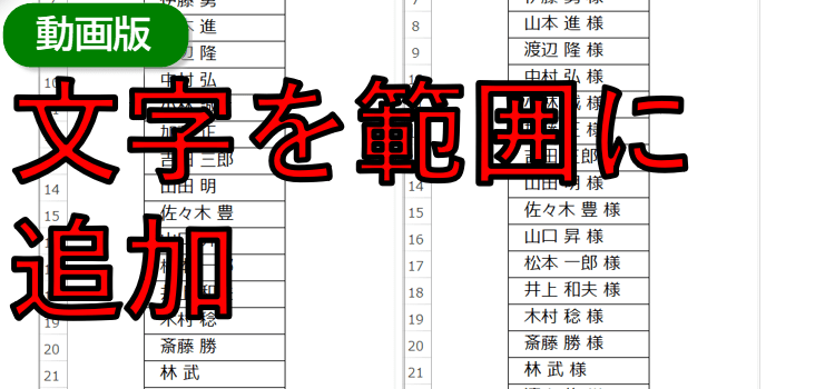 範囲に同じ文字を追加するマクロです。Excelでは文字列の後ろに同じ文字列を追加するというような作業が結構あります。 たとえば、名簿などで、急に名前に様をつける必要がある場合や、商品コードに文字を追加する場合などにこのマクロは便利かと思います。