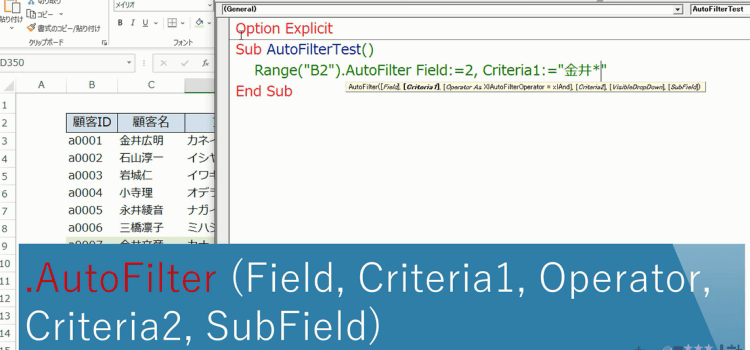 | 演算子 | 省略可能 | XlAutoFilterOperator | フィルターの種類を XlAutoFilterOperator の定数で指定します。 |