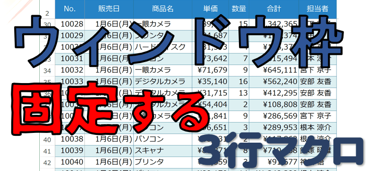 (サンプルファイルは、こちらです。 大きな売上表でも見出しが隠れないようにウィンドウを固定する、時短激うまExcelの3行マクロ~すぐに使えるミニマクロ46回サンプル)