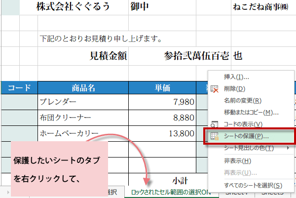 (4)保護したいシートタブを右クリックして、メニューからシートの保護を選択。