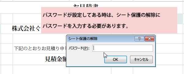 このパスワードはシートの保護状態を解除するときに必要ですので、忘れないようにメモしておきましょう。