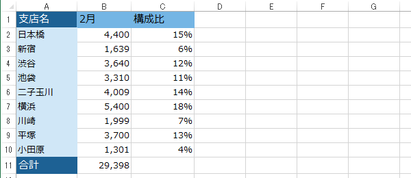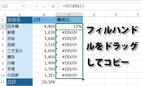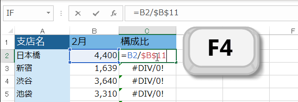 この場合だと、「C2」セルは構成比を出すために「B2(日本橋)/B11(合計)」という計算式を入力しています。
