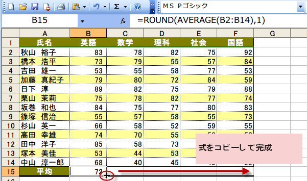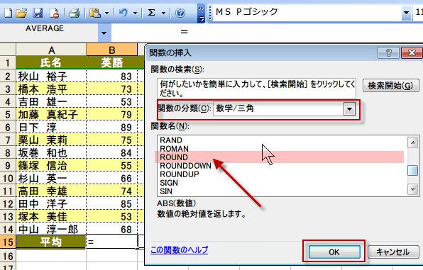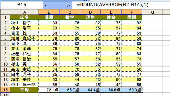 そこで、平均点は ROUND関数を使い、四捨五入で表示したいと思います。切り上げROUNDUP関数や切り捨てROUNDDOUWN関数の場合も同様の使い方ができます。