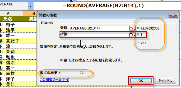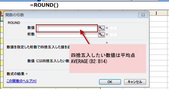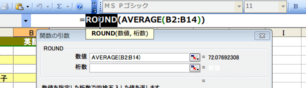 (6)これで、平均値を出す計算式は入力できたので、もう一度数式をROUND関数に戻します。