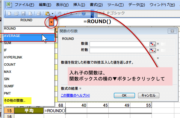 入れ子にしたAVERAGE関数から、もとのROUND関数への戻し方ですが、