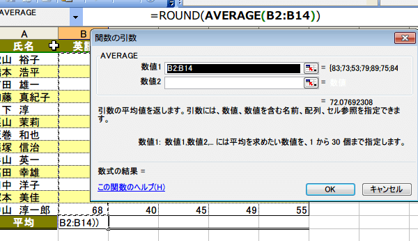 例では、「B2」から「B14」に入力された点数の平均値を四捨五入したいので、「B2」から「B14」の平均値を求める計算式を入力します。