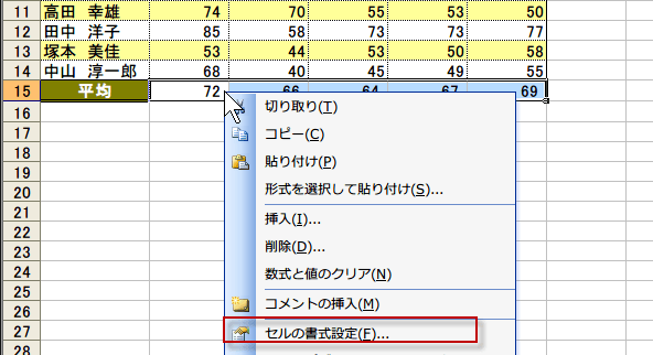 平均点を求めた後、書式設定で小数点以下の桁数を指定できますが、四捨五入までは自動でしてくれません。