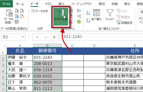 (1)はじめにB列の郵便番号の右隣に空白列を2つ作っておきます。