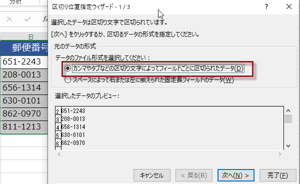 それから、B列を選択して「データ」タブから「区切り位置」を選択します。区切り位置指定ウィザードが開きます。「データのファイル形式」に「カンマやタブなどの区切り文字によってフィールドごとに区切られたデータ」にチェックして、「次へ」ボタンをクリックします。