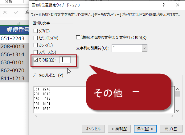 (3)「区切り位置指定ウィザード」3/3になります。区切り文字を指定します。