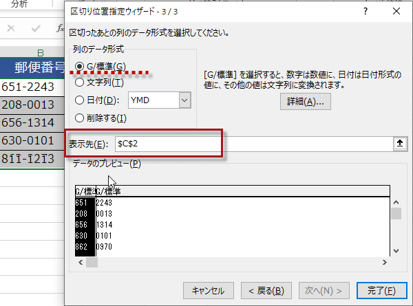ここでは区切ったあとの列のデータ形式を指定します。数値扱いしたいので、標準のままにしておきます。