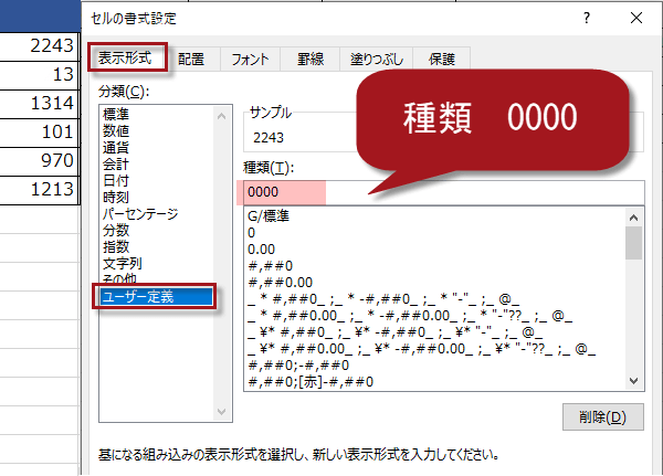 ユーザー定義には4桁で表示したいので、0000と指定してやります。