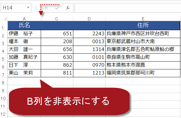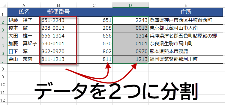 (6)郵便番号の下桁が4桁表示なりました。もとのB列については、あとで利用することも考えて非表示にしました。