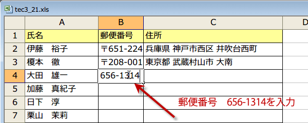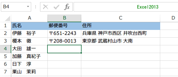 郵便番号を入力すると、〒のマークが付与され、隣の列に郵便番号に該当する住所が自動入力されます。