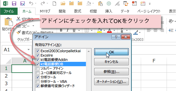 アドインダイアログが表示されたら、kt電話郵便アドインにチェックを入れてOKをクリックします。